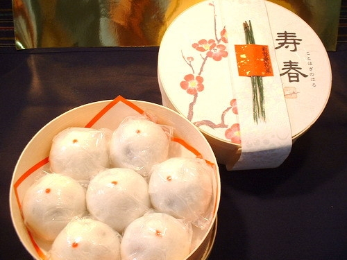■新春のお祝い菓子として、薯蕷まんじゅうの上にえくぼに見立てた赤い点をつけた、えくぼまんじゅうを7個詰め合わせたわっぱセットです。