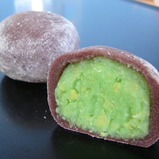 中のあんこに枝豆をすり潰して作ったずんだあんを使い、外の餅生地には古代米とも呼ばれる黒米を使った、ずんだ大福です。ずんだあんは大豆が主原料ですから、大豆の栄養素が丸ごと生きています。黒米は、お米の原種と言われ、縄文時代の遺跡から見つかったりします。ポリフェノールやお米が持つ本来の栄養素がふんだんに含まれています。だからこの紫福餅は今一番ヘルシーなお菓子です。