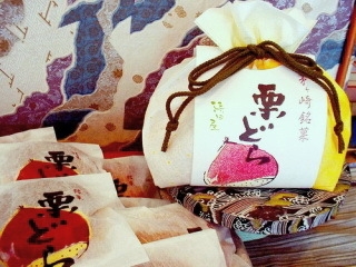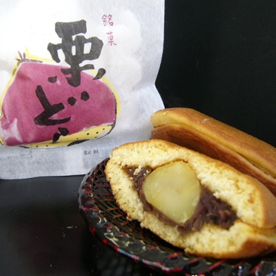 ■大粒のやわ栗が丸ごと一粒入ったちょっと大き目のどら焼です。じっくり煮上げた粒あんとしっとり柔らかな焼き皮が自慢です。